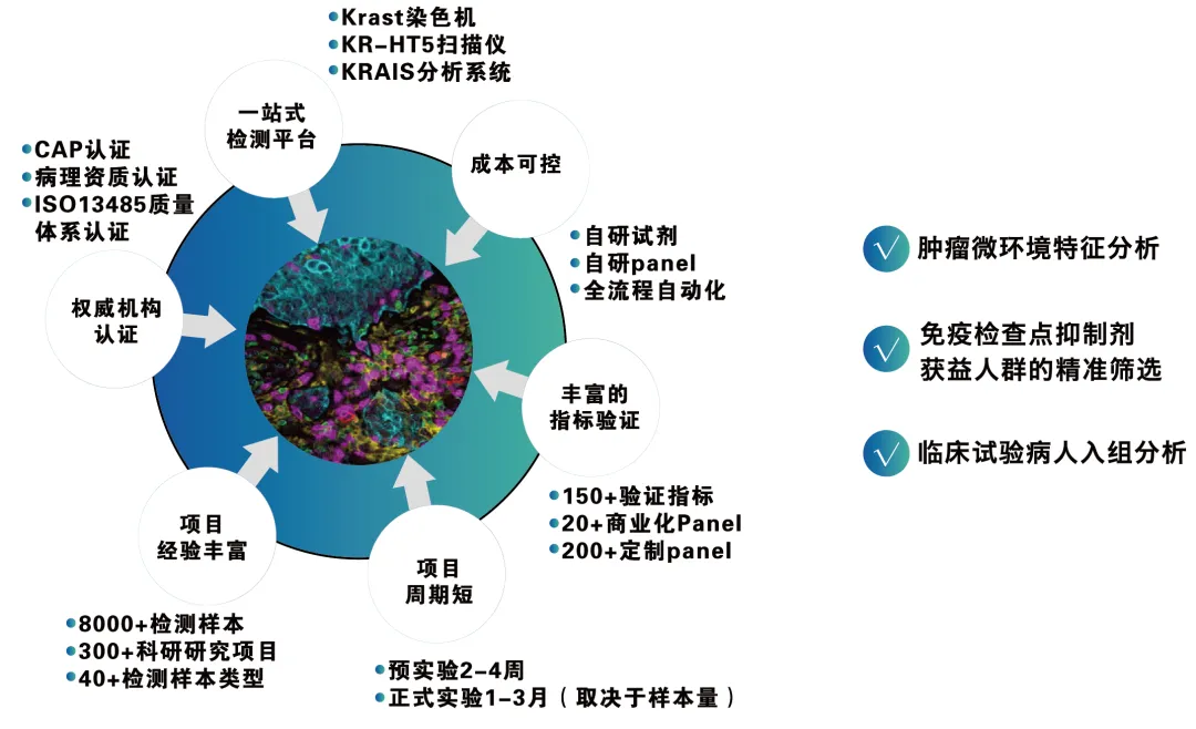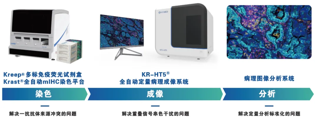 依托于阔然自研Krast自动染色机、KR-HT5扫描仪,可以根据不同生物组织样本进行检测方案定制对客户已有的多组学数据得到的靶标基因进行验证,实现3-9色的高通量免疫荧光定量分析。伯豪生物整体解决方案,全流程产品已获医疗器械备案或注册证,满足科研探索+临床检测。